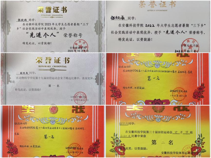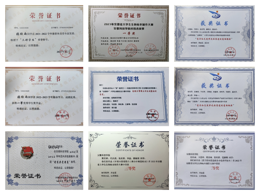 在科技创新方面,张欣雨自大一就积极参加各类学科竞赛,积累了许多课本中学不到的宝贵技能,目前已获得半岛app官方在线入口“互联网+”大学生创新创业大赛银奖、铜奖、优秀奖,半岛app官方在线入口全国大学生电子商务“创新、创意及创业”挑战赛三等奖,安徽省大学生生物标本制作大赛二等奖、三等奖。