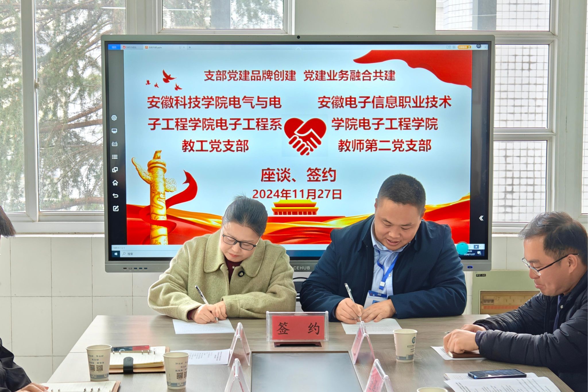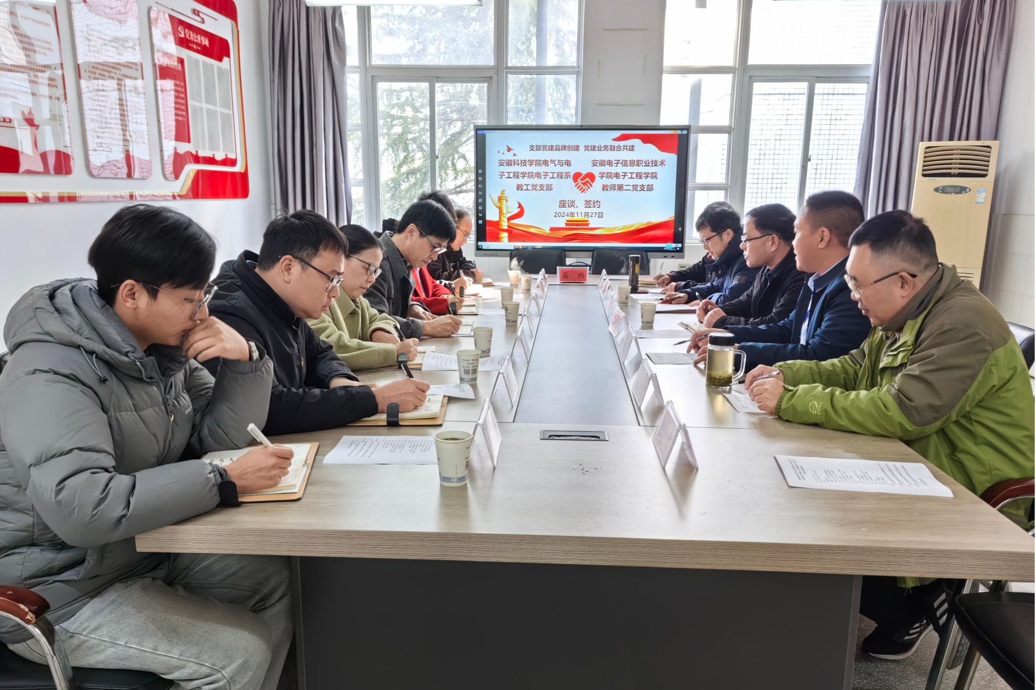 为拓宽高校基层党组织党建工作渠道,构建高校资源共享、相互促进、优势互补、共同提高的党建工作格局,2024年11月27日下午,半岛app官方在线入口电气与电子工程学院副院长樊晓宇及电子工程系教工党支部6名党员教师赴安徽电子信息职业技术学院与电子工程学院教师第二党支部开展结对共建主题党日活动。安徽电子信息职业技术学院电子工程学院院长方庆山参加了结对共建签约仪式。