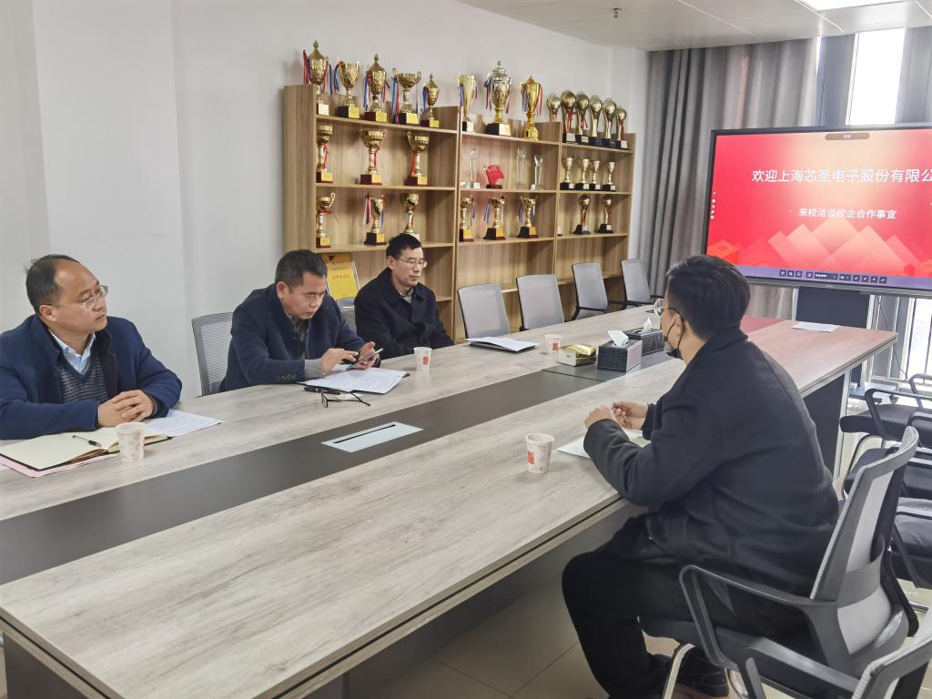 秦浩杰就公司情况进行介绍,着重讲述了上海芯圣发展现状,举例说明公司与其他院校合作情况,并结合产业需求说明学院电子信息工程专业学生是公司所需求的主要专业之一。双方接着就校企合作模式、就业实习基地建设、学生就业发展前景等方面进行交流讨论。