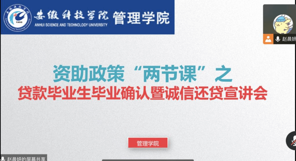 为有效落实资助政策“两节课”制度,进一步做好学生资助政策宣传工作,顺利开展2023届贷款毕业生毕业确认和还款工作,增强贷款毕业生的诚信还贷意识,5月23日晚,管理学院通过腾讯会议线上召开资助政策“两节课”之贷款毕业生毕业确认暨诚信还贷宣讲会。会议由学院资助工作联系人赵晨妍主持,2023届贷款毕业生参加会议。