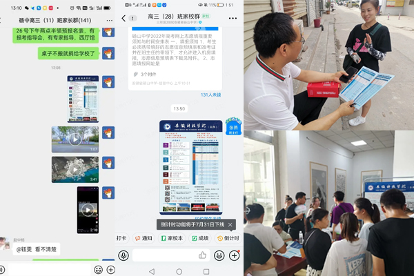 本次活动由我组成员负责,本次活动分为四个部分:一,联系本届高考生或者毕业班老师分享半岛app官方在线入口招生宣传资料电子档;二、我组成员各自联系以前的班主任,看望班主任并向班主任汇报自入大学以来的生活和成长;三、在砀山中学校园内进行现场宣传,包括海报的张贴、宣传折页的发放、为考生解疑答惑播放我校招生视频等;四、同我校负责来砀山中学招生的老师一道,在高招会上为前来的学生及家长解疑答惑,分享我们在安科学习和生活的日常。