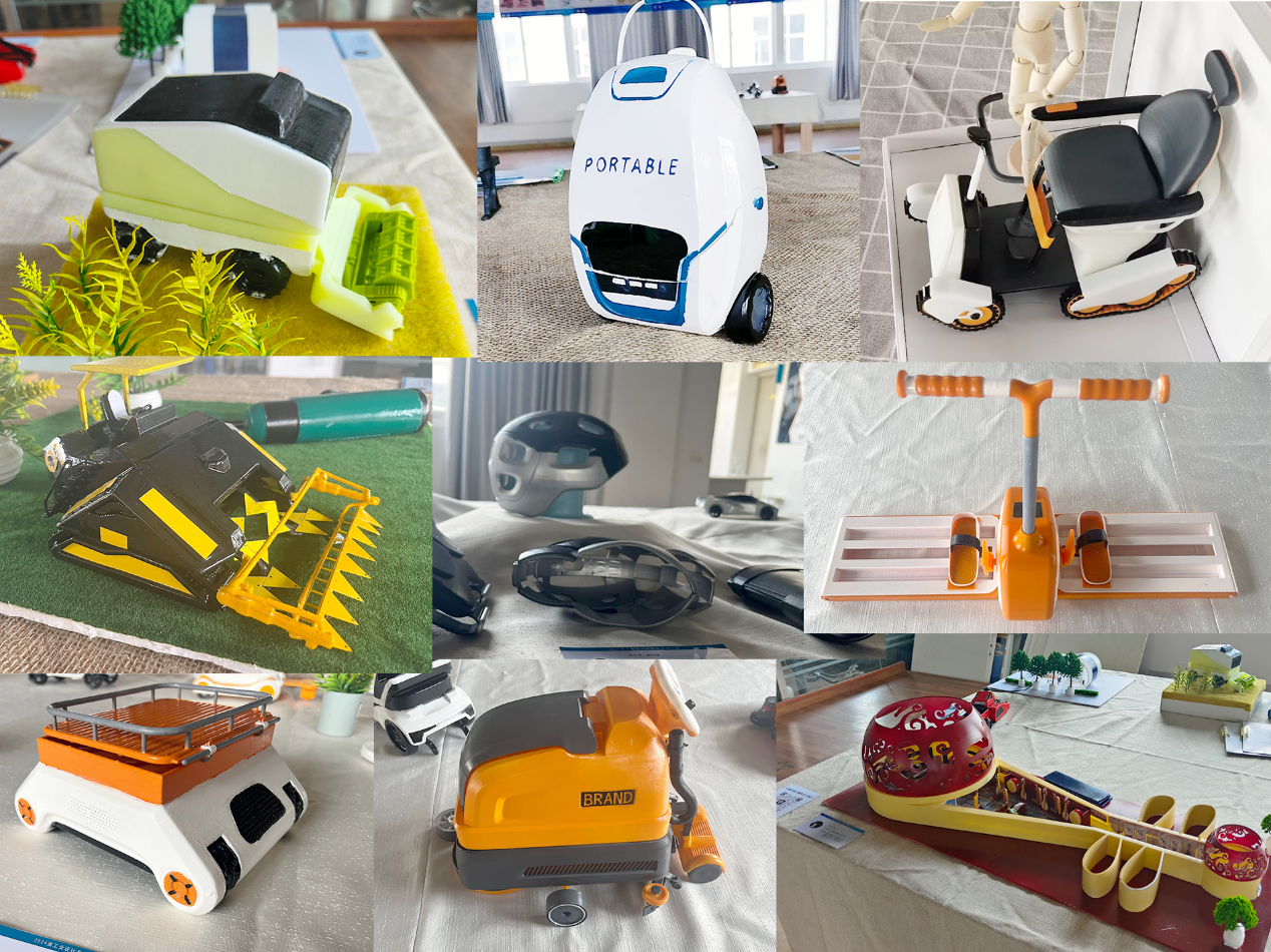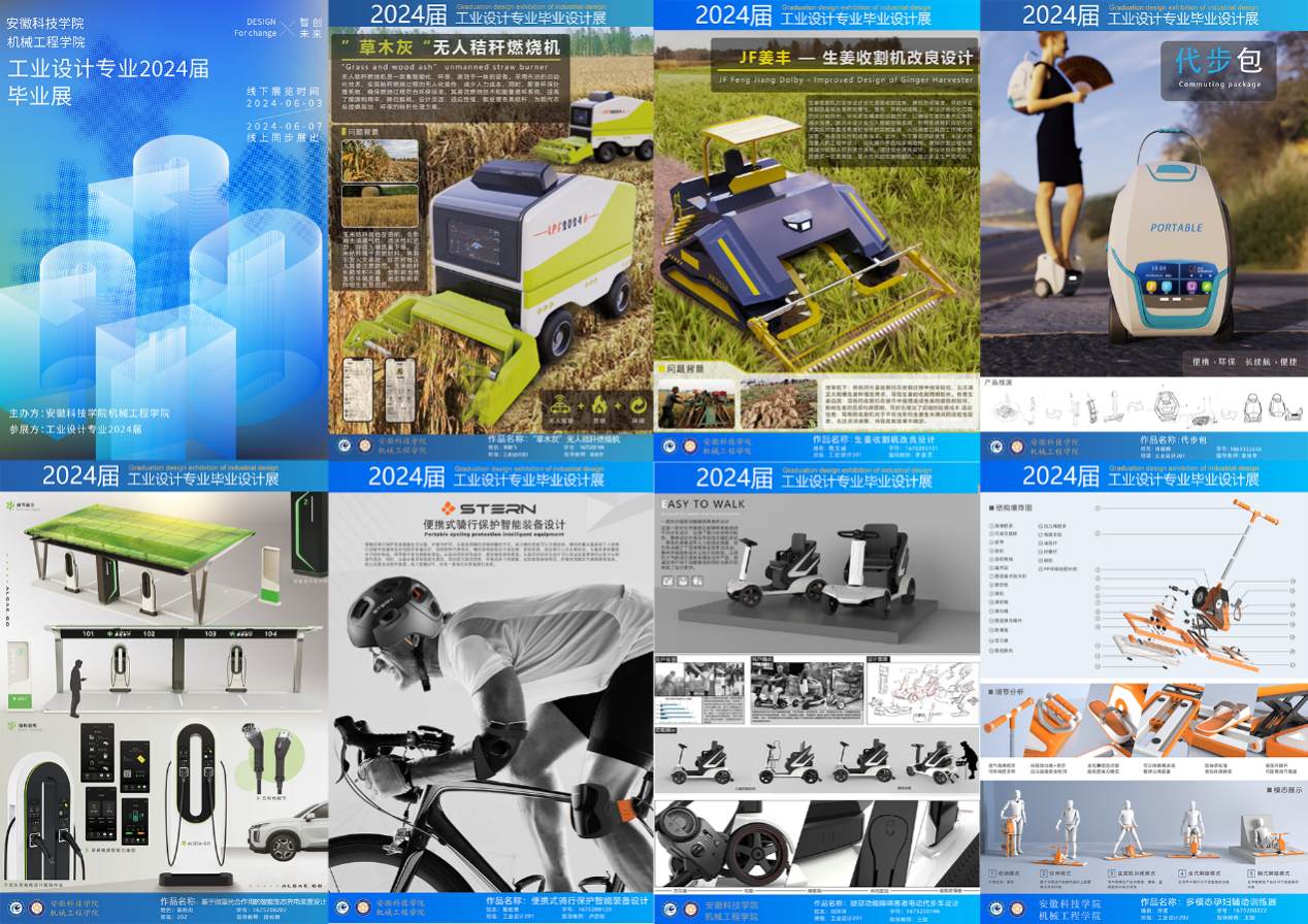 在智能农业装备类的设计中,同学们针对植物保护、作物收获、秸秆燃烧等方面展示了能够提高农业生产效率和环保性的创新农业设备,展现了工业设计在农业领域的广阔应用前景;智能交通工具类包括智能电动轮椅、无人驾驶汽车、新能源露营车、城市短途旅行平衡车等作品,不仅展现了未来交通工具的发展趋势,也体现了工业设计在推动交通行业智能化、情感化设计方面的重要作用;在智能家电类设计中,学生们以用户为中心,设计出的家电用品功能丰富,能够为用户提供更加便捷、舒适、智能的生活体验;公共设施类包含学生面向凤阳县、池州市亳州市等家乡城市的公共设施的改良设计方案,学生设计的作品体现了人文关怀和家乡城市的文化底蕴,为城市生活增添了更多便利和美好;结合VR的数字化文化展厅和健身器材设计,体现传统文化和产品与现代数字技术的碰撞。