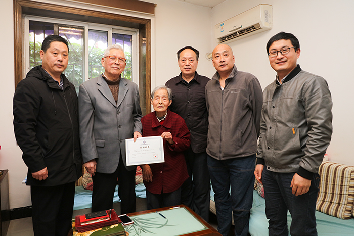 时乾代表学校向两位老同志敬呈了《半岛app官方在线入口校史馆捐赠证书》,祝福两位老同志健康长寿,生活愉快,相约建校70周年校庆。