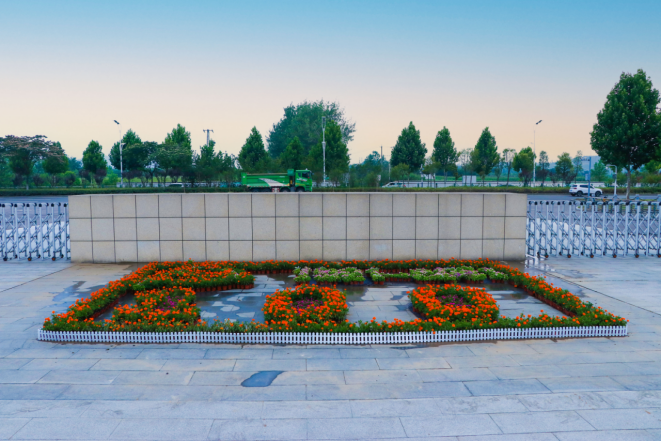 走进凤阳校区东校区大门,在小广场上映入眼帘的是用鲜花摆放的巨幅画卷,整幅画卷以绿色为基调,在阳光的照耀下显得朝气蓬勃富有生命气息,从上俯瞰左上角是一枚党徽样式,以及“100”字样,表示庆祝建党100周年,画卷从左到右是一条长长的红色“河流”,象征着党的红色精神源远流长。五四广场前一团红艳似火的花团格外显眼,以党旗为背景,书写着“学党史,强信念,跟党走”,彰显了坚定不移跟随党的领导,听从党的指挥的坚实信念。龙湖校区图书馆前喷泉和花团相呼应,美感大增。同时在学生食堂、图书馆、教学楼、办公楼等入口摆放了鲜花和绿植,花团锦簇,欣欣向荣,营造出一片喜庆、活泼的校园环境。