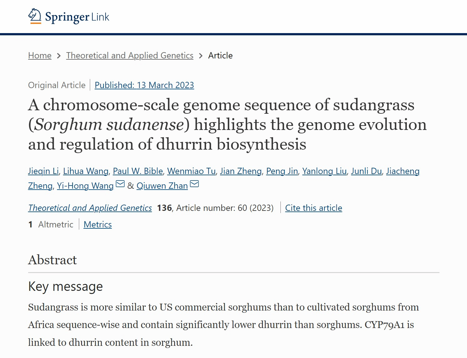 3月13日,由我校李杰勤教授、王丽华老师和美国马里安大学(Marian University)Paul W. Bible教授为共同第一作者,我校詹秋文教授、美国路易斯安那大学拉法叶分校Yi-Hong Wang教授为共同通讯作者的论文“A chromosome‑scale genome sequence of sudangrass (Sorghumsudanense) highlights the genome evolution and regulation of dhurrin biosynthesis”,在国际著名学术期刊《Theoretical and Applied Genetics》(中国科学院一区)在线发表。该研究在全球首次破译了苏丹草的基因组,对促进苏丹草和饲用高粱及高丹草(高粱-苏丹草杂交种)的品种改良具有重要意义。