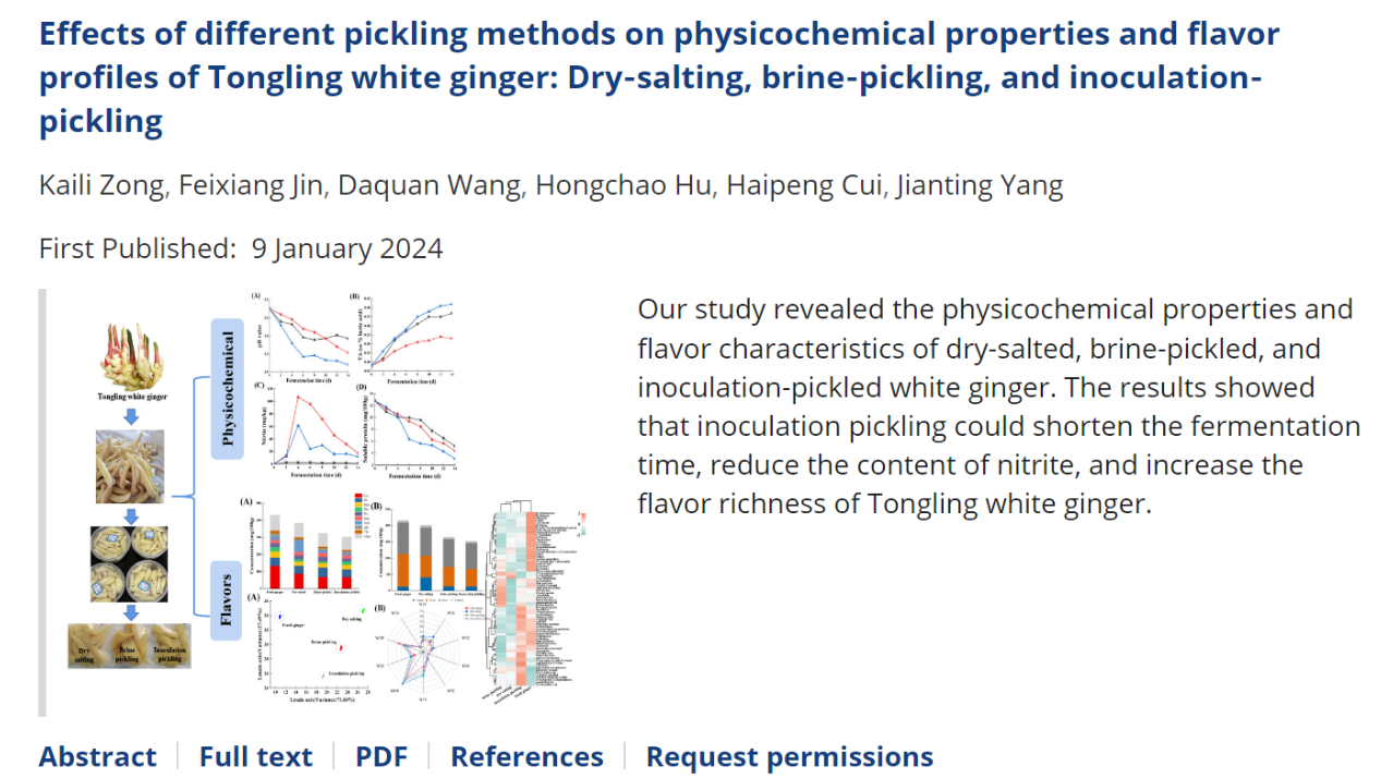 1月9日,我校果蔬精深加工与营养控制创新团队在农林科学领域二区期刊Food Science & Nutrition(IF=3.90)在线发表题为“Effects of different pickling methods on physicochemical properties and flavor profiles of Tongling white ginger: Dry‐salting, brine‐pickling, and inoculation‐pickling”的研究论文。我校食品工程学院2021级食品加工与安全领域研究生纵凯莉为第一作者,杨剑婷副教授为通讯作者,半岛app官方在线入口为唯一完成单位。