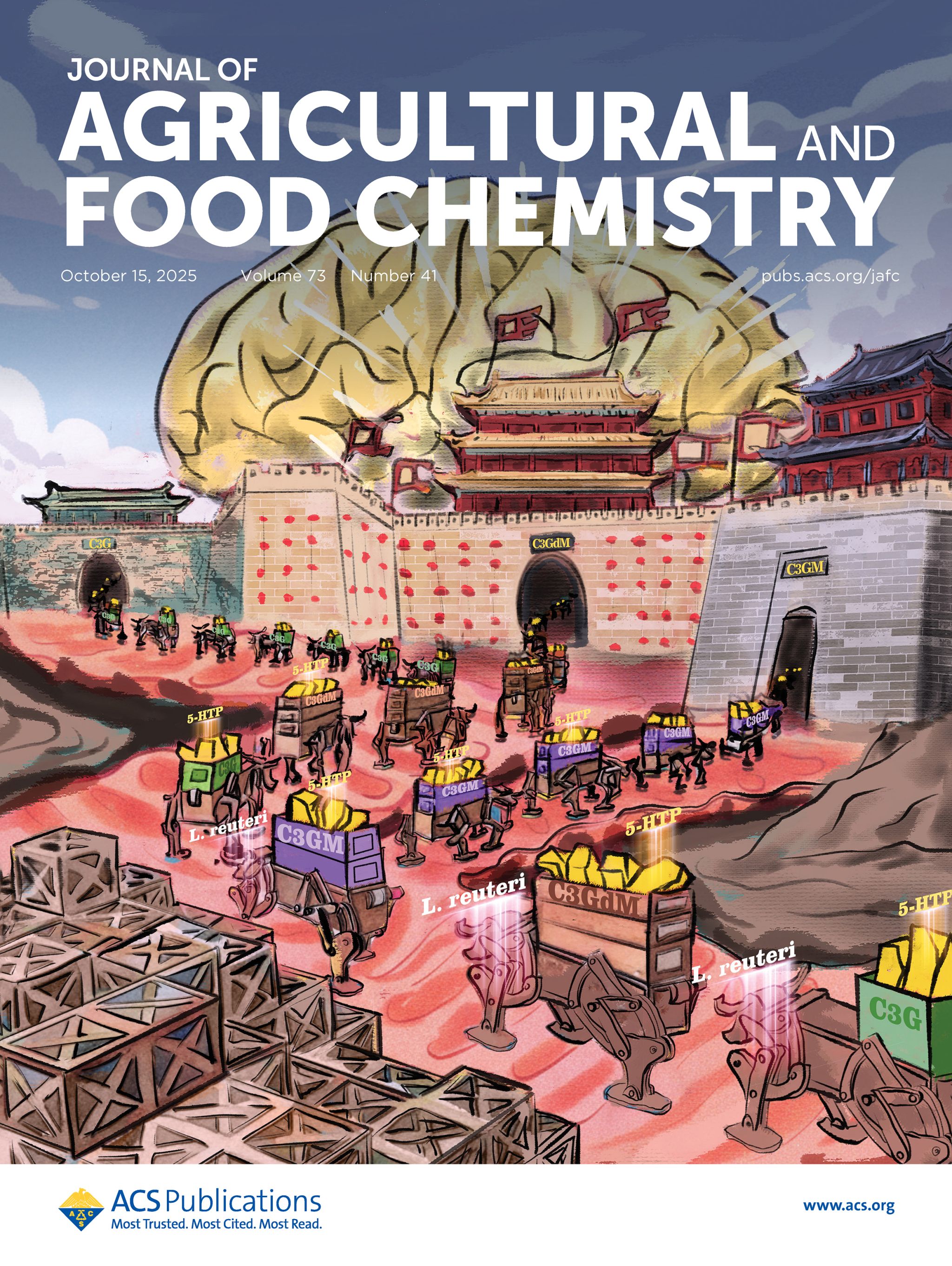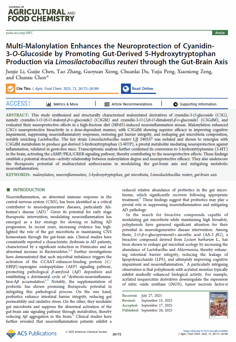 近日,我校食品科学与工程学院分子加工与精准营养实验室陈春旭副教授团队在美国化学学会期刊《Journal of Agricultural and Food Chemistry》(中科院一区TOP,IF 6.2)最新一期(2025,Volume 73, Issue 41)发表封面论文《Multi-Malonylation Enhances the Neuroprotection of Cyanidin-3-O-Glucoside by Promoting Gut-Derived 5-Hydroxytryptophan Production via Limosilactobacillus reuteri through the Gut-Brain Axis》。第一作者为李俊杰硕士,通讯作者为陈春旭副教授,半岛app官方在线入口为第一署名单位。该文是陈春旭副教授团队近年来在Journal of Agricultural and Food Chemistry上发表的第5篇论文,也是该团队第2次登上该期刊的封面。