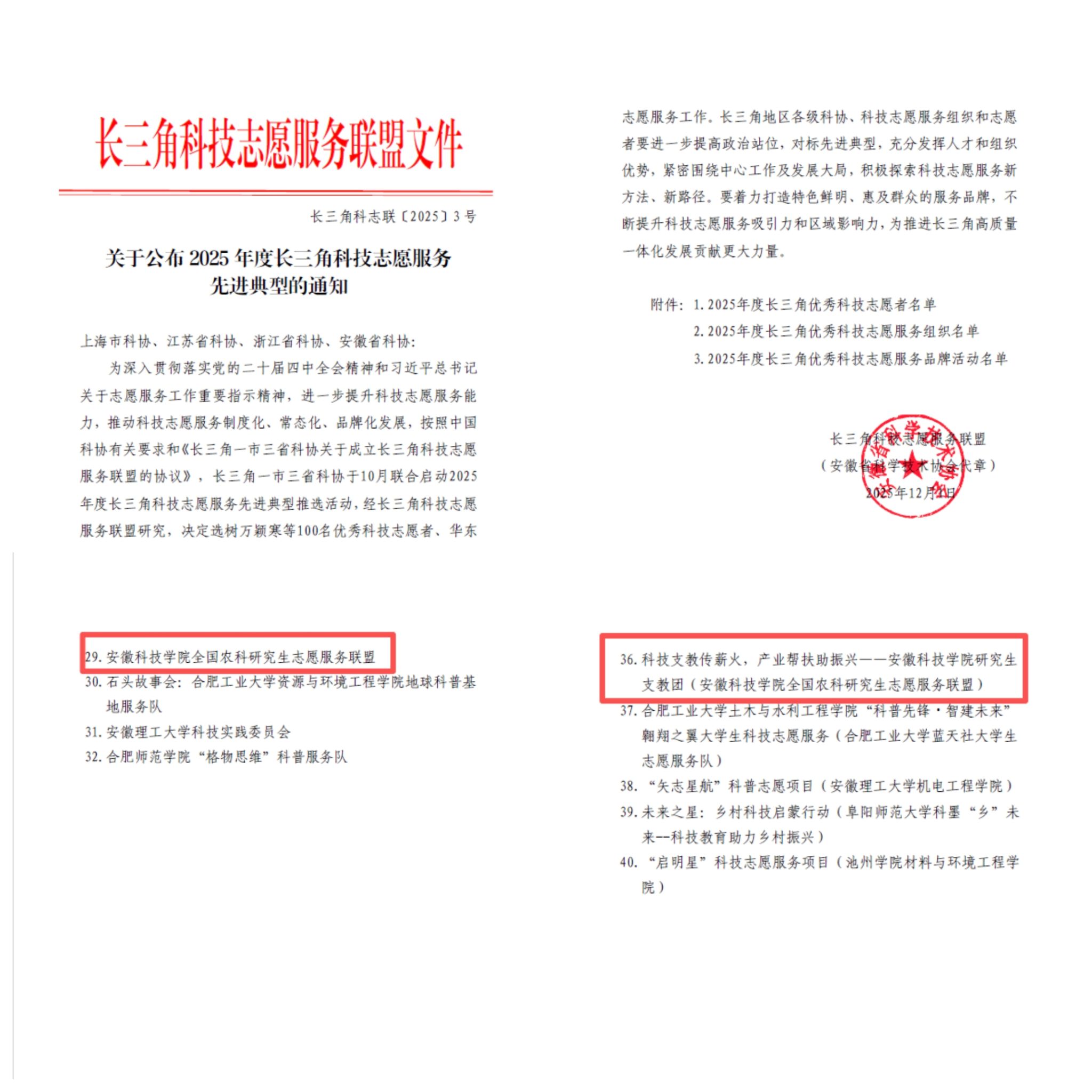 近日,长三角科技志愿服务联盟正式公布2025年度长三角科技志愿服务先进典型名单,我校勇创佳绩。“全国农科研究生志愿服务联盟”获评“2025年度长三角优秀科技志愿服务组织”称号,“科技支教传薪火,产业帮扶助振兴”研究生支教团项目成功获评“2025年度长三角优秀科技志愿服务品牌活动”。
