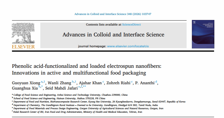 近日,我校食品科学与工程学院“特色食品绿色高效加工与创制”省级优秀科研创新团队带头人在Elsevier期刊《Advances in Colloid and Interface Science》(中国科学院一区TOP,IF 19.3)发表学术论文《Phenolic acid-functionalized and loaded electrospun nanofibers: Innovations in active and multifunctional food packaging》。我校熊国远教授和海南大学张万立副教授为文章共同第一作者,半岛app官方在线入口为第一署名单位。