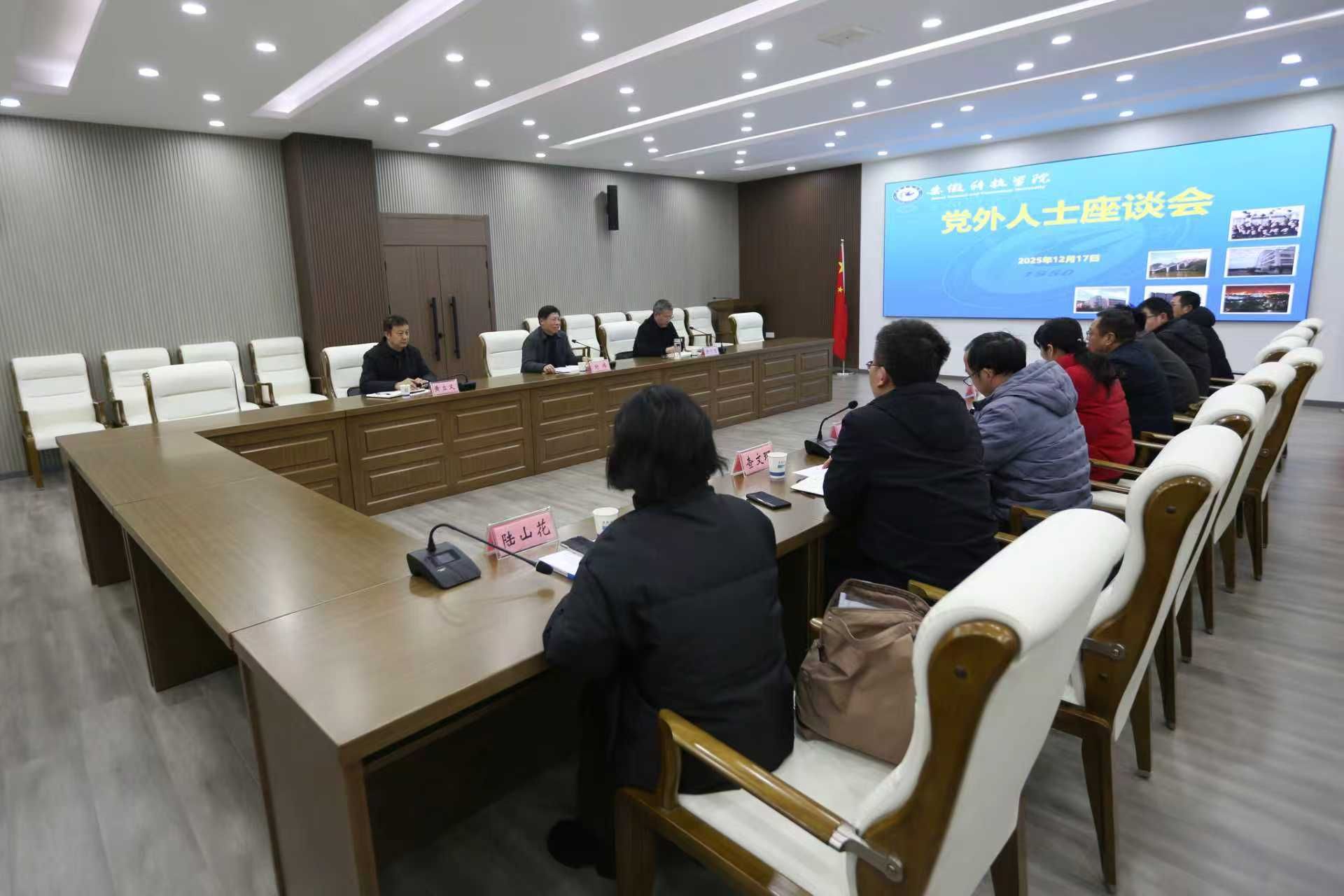 12月17日下午,学校在凤阳校区图书馆B多功能厅召开党外人士座谈会。党委书记时伟出席会议并讲话。党委副书记曹付忠主持会议。党委统战部、民盟半岛app官方在线入口总支、民进半岛app官方在线入口支部、九三学社半岛app官方在线入口支社,校知联会、校侨(留)联负责人、农工党党员、无党派人士代表等参加会议。