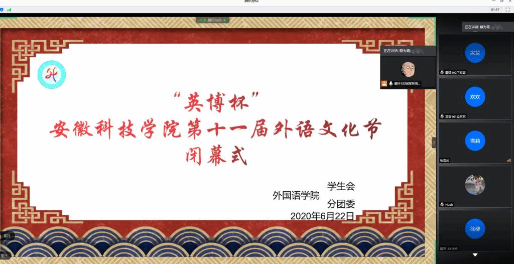 6月22日晚上,外国语学院在腾讯会议隆重举行“英博杯”半岛app官方在线入口第十一届外语文化节闭幕式。校党委委员、宣传(统战)部长卫胜,校团委书记黄立义,外国语学院院长陈德用、党总支书记蔡为青、副院长刘萍及部分老师出席“线上”闭幕式,学院大部分学生参加闭幕式,闭幕式由蔡为青主持。