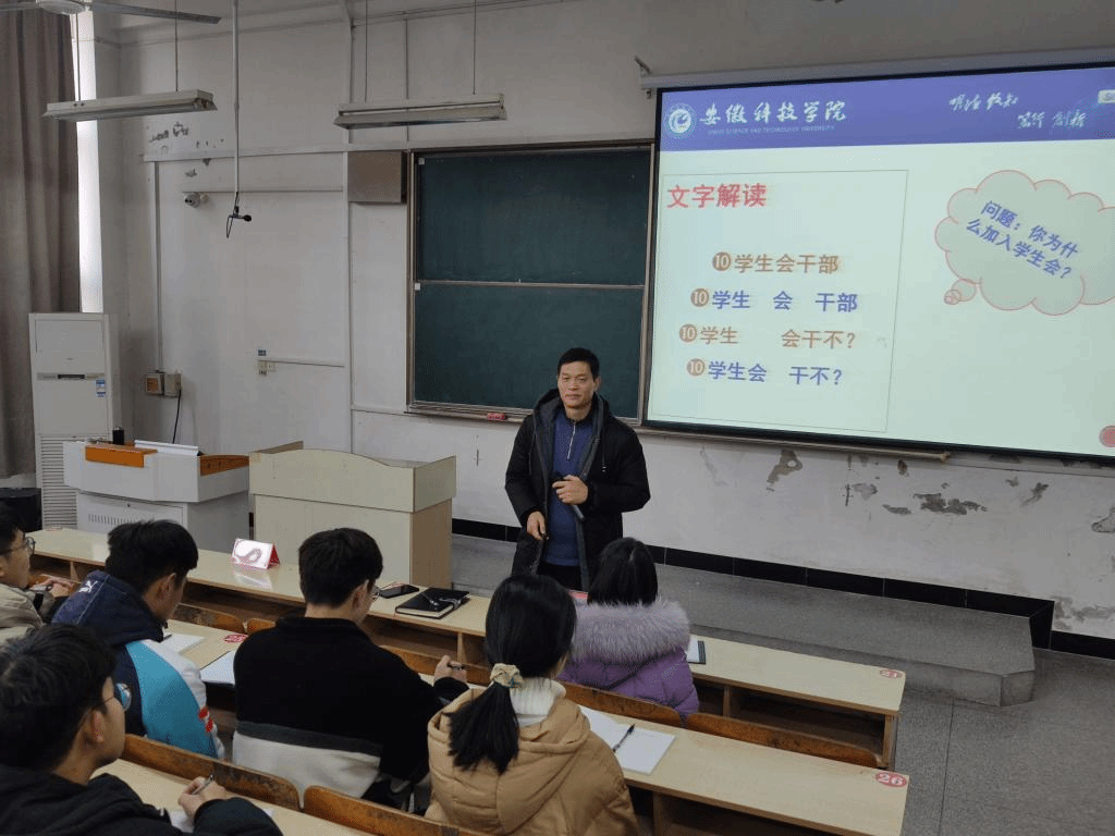 讲座中,学员李俊杰根据付光玺就讲座上的问题“你当初为什么加入学生会”回答道:“加入学生会,是为了能够锻炼自我,提高自己的社交能力,不断进步,更好地为他人服务。”