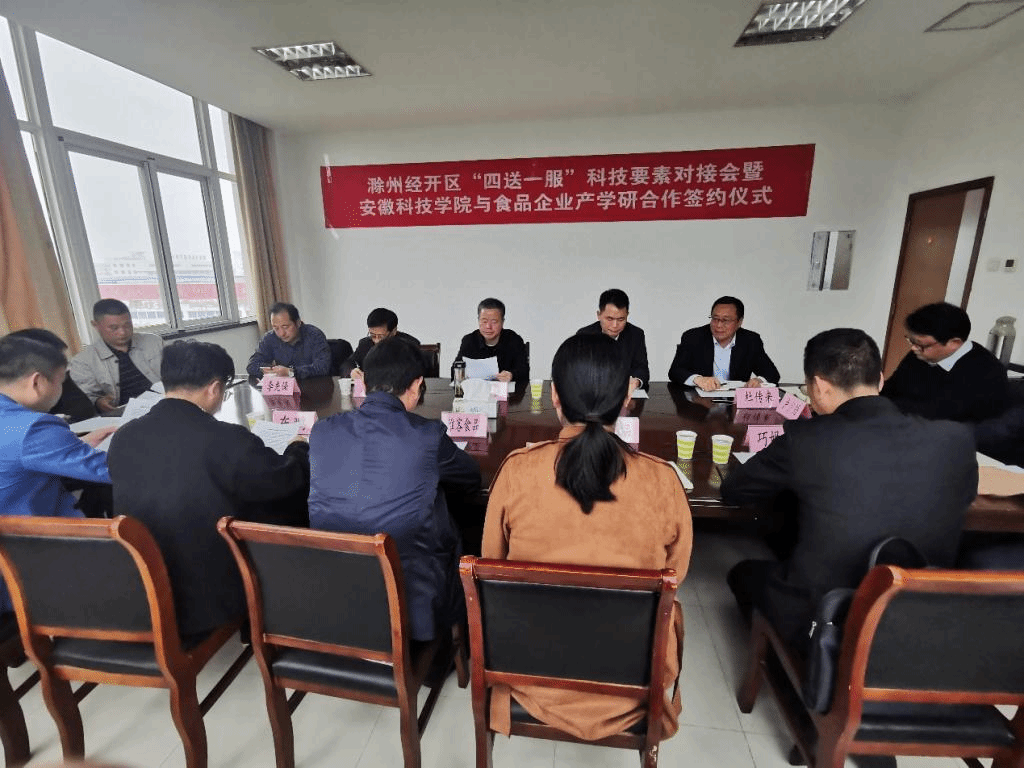 4月22日下午,在滁州经开区管委会四楼会议室举行滁州经开区“四送一服”科技要素对接会暨半岛app官方在线入口与滁州经开区食品企业产学研合作签约仪式。我校食品工程学院院长杜传来、服务地方发展研究院院长詹秋文、特色农产品加工研究所所长李先保及彭钢、马菲菲两位专任教师参加此次对接会及签约仪式。滁州市经信局副局长张正强、滁州市科技局总工程师卢少悟、滁州经开区管委会副主任潘金钟、滁州经开区企业服务中心主任刘钊以及安徽盼盼食品有限公司、安徽银鹭食品有限公司、安徽东鹏饮料有限公司、安徽巧妈妈食品科技有限公司、雅客食品(滁州)有限公司的代表等出席签约仪式,仪式由滁州经开区管委会副主任潘金钟主持。