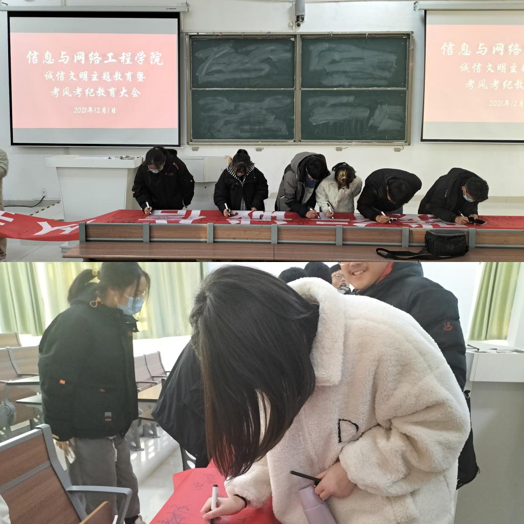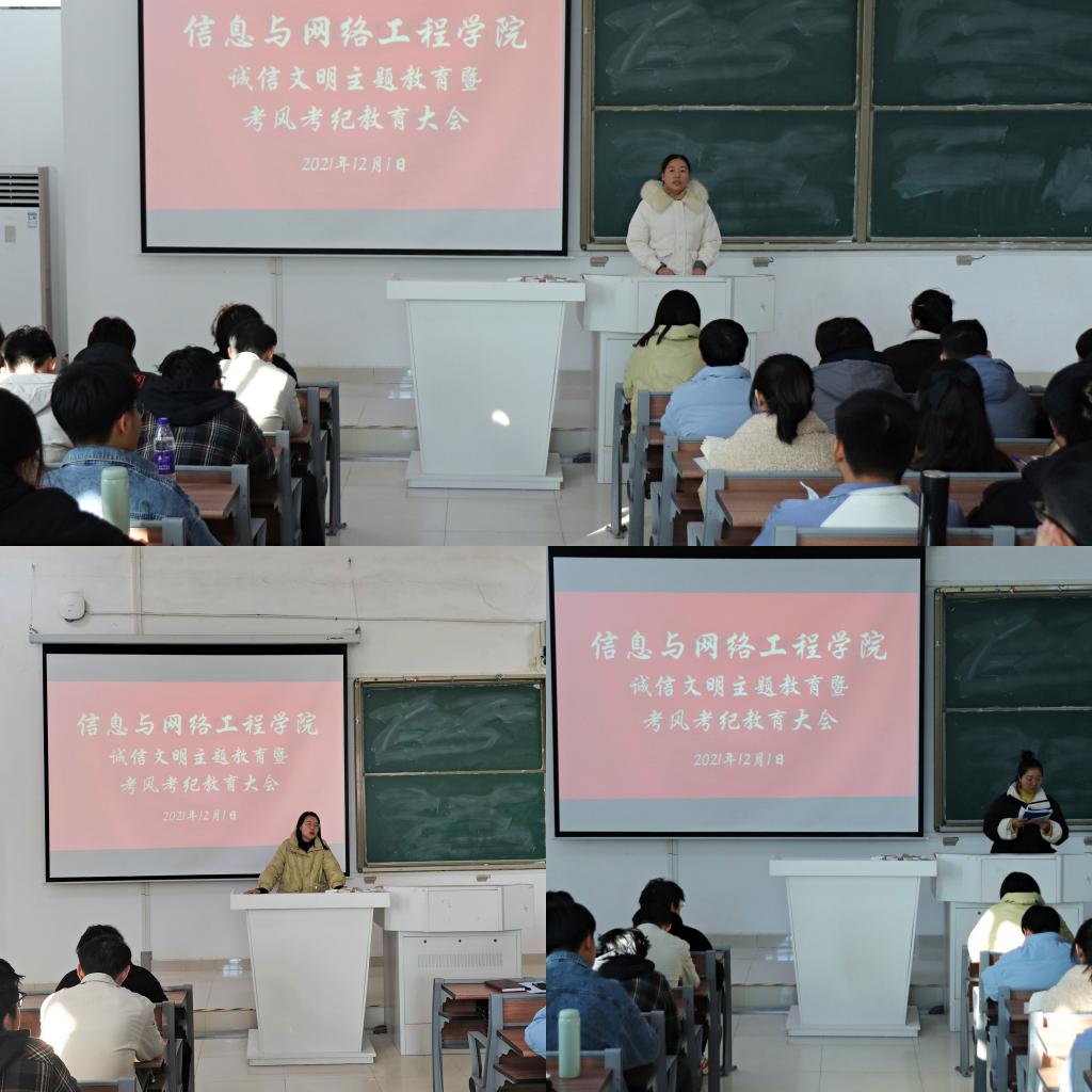 在考风考纪教育阶段。丁阿敏带领大家学习了《半岛app官方在线入口考试工作实施细则(节选)》《半岛app官方在线入口学生违纪处分办法》的部分内容及相关学生违纪处分文件,宣读了《信息与网络工程学院诚信考试倡议书》,倡导学生心中有诚信、手握纸和笔,坚决抵制作弊行为,创造优良学风,端正考风。韦乃学从“什么是考试”“为什么要考试”等问题出发,引导同学们对于考试树立正确的认知,分析了考试作弊对于学生的危害,并对各班级学生干部提出以下三点要求:一要认真复习、积极备考,树立底线思维;二要召开主题班会,学习相关文件,加强警示教育;三要发挥积极作用,及时关注,做好预防。