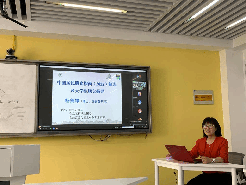 在2022年全民营养周和中国学生营养日来临之际,为提高全民营养意识,提倡健康生活方式,树立科学饮理念,5月18日,食品工程学院食品营养与安全系教工党支部联合院团委、食为天协会在凤阳校区多功能教室共同举办了《中国居民膳食指南(2022)解读及大学生膳食指导》讲座。活动以线上和线下结合的方式面向两校区开展。食品营养与安全系教工党支部书记杨剑婷博士担任主讲。