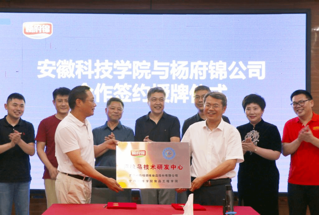 6月16日,杜传来一行首先参观考察了安徽杨府锦调味食品股份有限公司、安徽食亿鲜食品有限公司,并与企业就开展校企产学研合作、学生实习与就业、企业生产中遇到的技术难题和公司下一步的发展规划等事宜进行了充分的沟通、交流和讨论。双方一致同意将在产品开发、科技创新、联合人才培养、就业与培训、资源共享等方面搭建平台,依托产学研项目深入开展合作与交流。调研之后,杜传来代表学院与安徽杨府锦调味食品股份有限公司董事长杨连广签署了鲜味肽和玉米发酵酱项目合作协议,并共同举行了调味品技术研发中心授牌仪式。