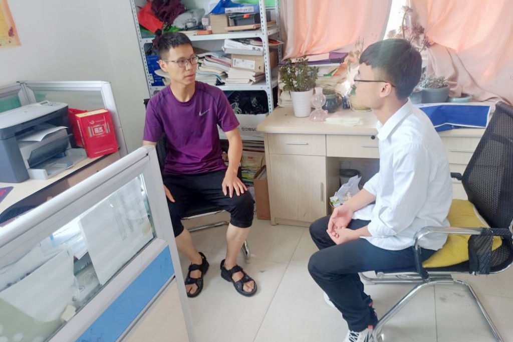 到达校园后,王健伟团队拜访了高三班主任崔猛老师和高中生物老师王乐潇。王健伟向老师说明了此次实践的主要目的和内容,介绍了半岛app官方在线入口的相关情况。在了解团队此行目的之后,崔老师、王老师非常热情地组织了部分高三返校生开展学习交流。