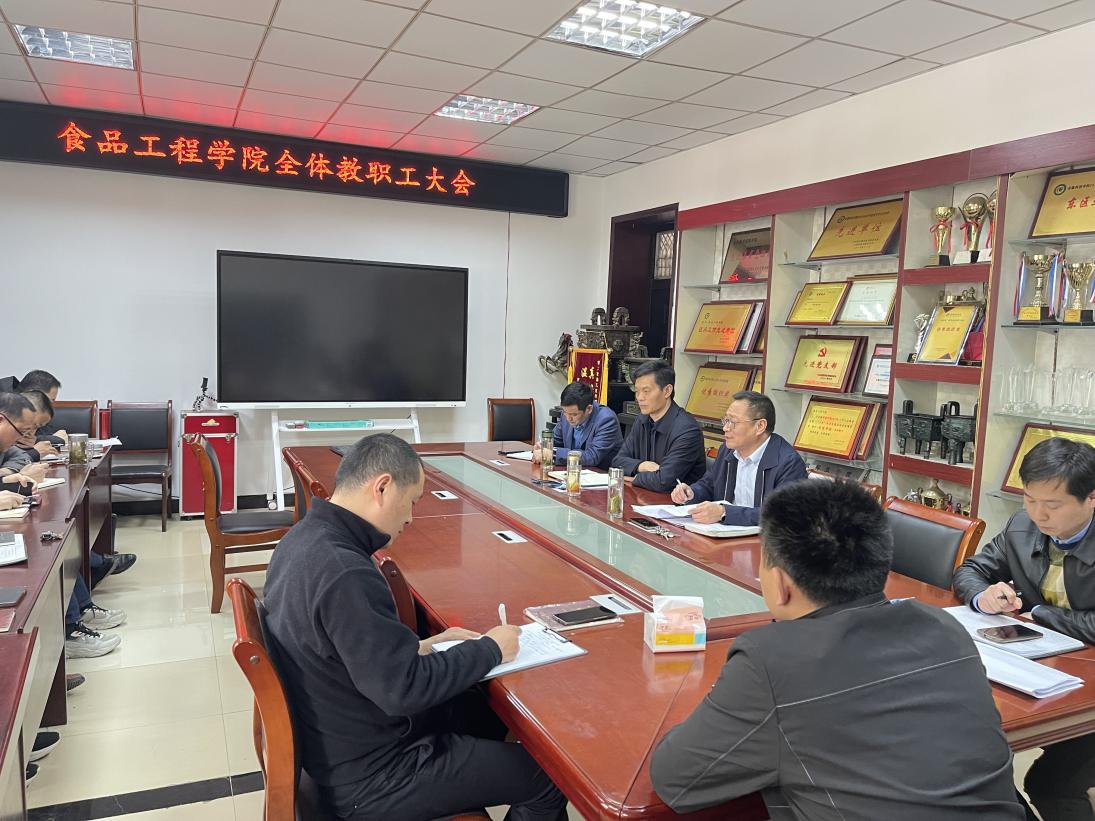 4月12日下午,食品工程学院召开全体教职工大会,就本科教育教学审核评估工作进行再动员、再部署,推进审核评估工作落地落实落细,会议由食品工程学院党委书记付光玺主持,院长杜传来、副书记王广良、副院长郑海波、副院长翟立公及全体教职工参加此次会议。