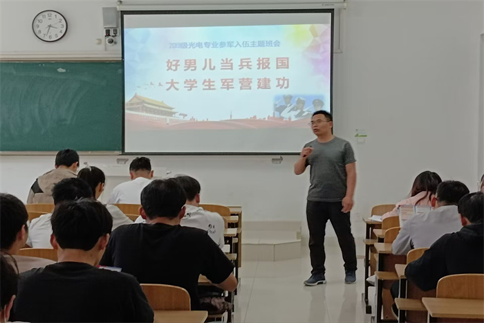 各毕业班分别以“投笔从戎,绽放青春”“好男儿当兵报国,大学生军营建功”为题召开主题班会。发放“大学生应征入伍‘明白卡’”,以音视频等多种形式分享了学院近几年毕业生在军营的亲身感受,让学生对军营有了更加直观的认识。会后,毕业班辅导员深入宿舍与毕业生深度交流,引导学生参军入伍,坚定献身国防的理想信念。