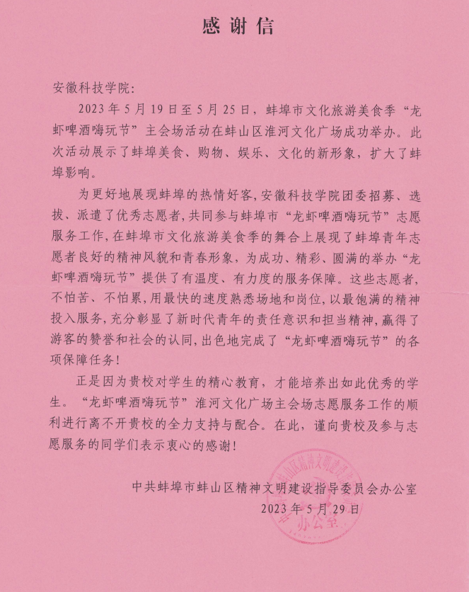 感谢信提到,半岛app官方在线入口团委招募、选拔、派遣了优秀志愿者,共同参与蚌埠市“龙虾啤酒嗨玩节”志愿服务工作,在蚌埠市文化旅游美食季的舞合上展现了蚌埠青年志愿者良好的精神风貌和青春形象,为成功、精彩、圆满的举办“龙虾啤酒嗨玩节”提供了有温度、有力度的服务保障。志愿者们不怕苦、不怕累,用最快的速度熟悉场地和岗位,以最饱满的精神投入服务,充分彰显了新时代青年的责任意识和担当精神,赢得了游客的赞誉和社会的认同,出色地完成了“龙虾啤酒嗨玩节”的各项保障任务!正是因为贵校对学生的精心教育,才能培养出如此优秀的学生。“龙虾啤酒嗨玩节”淮河文化广场主会场志愿服务工作的顺利进行离不开贵校的全力支持与配合。在此,谨向贵校及参与志愿服务的同学们表示衷心的感谢。
