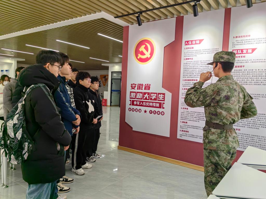 实地参观提升报国情怀。学院组织各年级学生前往一站式社区征兵宣传区域开展实地参观,通过对革命战争时期一个个历史事件和一位位英雄人物的学习,进一步提升了学生们的报国情怀。学院还邀请八一社成员、退伍复学新生张少伟给大家谈部队生活和入伍的感受,以此激励更多有志青年投身军营,以身报国。