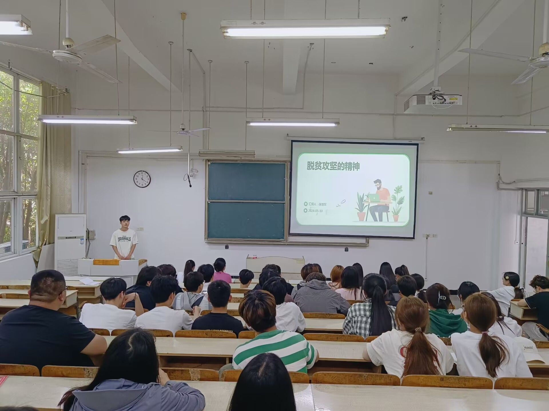 围绕脱贫攻坚精神,徐浩东从脱贫攻坚背景、脱贫攻坚精神内涵解读、大学生如何践行脱贫攻坚精神、校园内外扶贫活动案例分享以及总结反思与心得体会进行讲解。他强调,大学生应当树立正确价值观导向,把脱贫攻坚作为服务人民、奉献社会的重要实践,积极参加社会实践活动,结合所学专业知识帮助当地人民,关注弱势群体,传递正能量。此外,他还分享了一些校园内外扶贫活动案例和个人成长收获,呼吁同学们将所学应用于实际生活中。他还鼓励学生会成员要学习基层工作者无私奉献、一心为民的精神,将为同学服务内化于心、外化于行,真正做到为同学办实事。