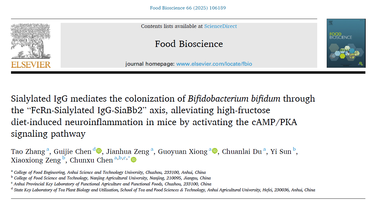 近日,食品科学与工程学院陈春旭副教授以通讯作者身份在国际Top期刊《Food Bioscience》(Q1,影响因子4.8)发表了题为“Sialylated IgG mediates the colonization ofBifidobacterium bifidumthrough the “FcRn-Sialylated IgG-SiaBb2” axis, alleviating high-fructose diet-induced neuroinflammation in mice by activating the cAMP/PKA signaling pathway”的研究论文,论文的第一作者为半岛app官方在线入口2023级食品加工与安全专业硕士研究生张涛,半岛app官方在线入口为第一完成单位,南京农业大学曾晓雄教授课题组为合作单位。