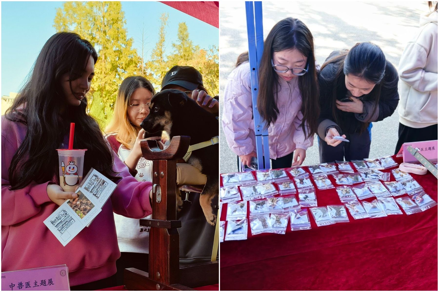 在中兽医特色主题展区,展台上中兽医诊疗器械与各类中草药样本整齐陈列,每件展品都标注了详细信息及功效。知识宣传区前,师生驻足聆听讲解,志愿者提供现场咨询服务,解答中兽医诊疗相关问题,让传统诊疗智慧深入人心。