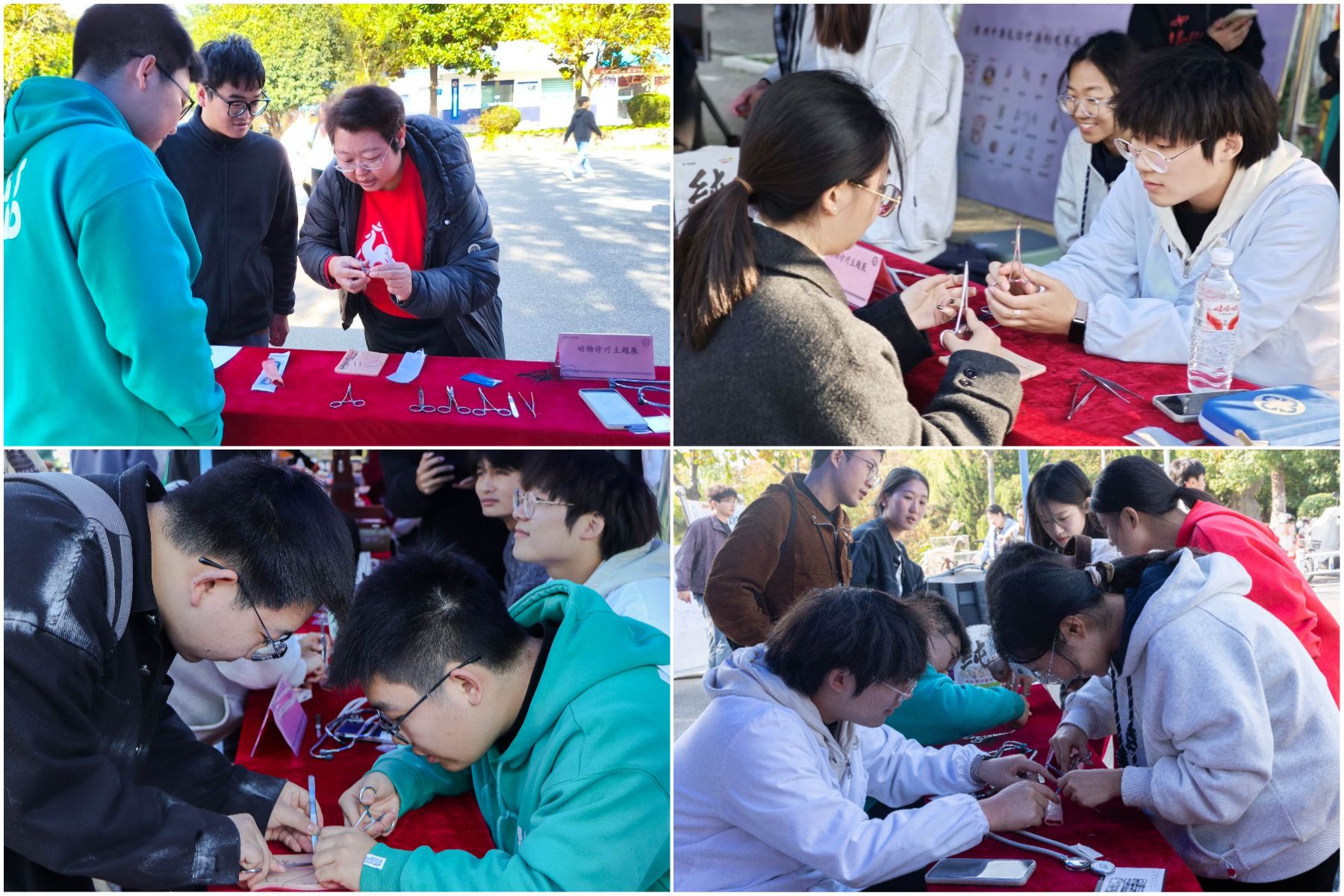 在伴侣动物展示区,宠物猫、宠物狗等伴侣动物在专业人员的看护下与师生见面,专业人员细致讲解其生活习性、科学饲养及护理知识。在动物诊疗展示区,手术器械、诊疗设备陈列整齐,志愿者现场介绍各类器械用途,模拟缝合互动区吸引大量师生驻足,在高年级学生的指导下,参观者们了解缝合分类,体验缝合方法,直观感受动物诊疗的严谨与专业。