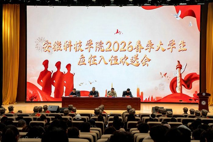 3月13日下午,学校2026年春季大学生应征入伍欢送会在龙湖校区东辅楼二楼报告厅举行。校党委副书记曹付忠、蚌埠市蚌山区人武部副部长张少辉出席欢送会。学生处、保卫处负责同志、各学院党委副书记、应征入伍学生辅导员、学生家长代表、在校生代表参加欢送会。欢送会由党委学工部部长、学生处处长、人武部部长张传德主持。