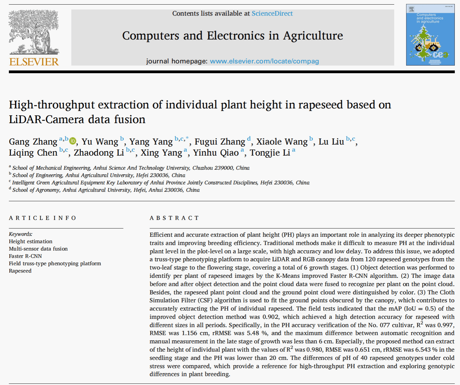 近日,我校智能制造学院教师张刚(第一单位/第一作者)在国际学术期刊《Computers and Electronics in Agriculture》(中科院1区TOP期刊(农林科学),IF:7.367)上发表了题为《High-throughput extraction of individual plant height in rapeseed based on LiDAR-Camera data fusion》的研究论文。该研究提出了一种基于雷达与相机数据融合的高通量油菜个体株高提取方法,实现了从两叶期至开花期多生长阶段下油菜株高的精准、高效测量,为作物育种表型分析提供了可靠的技术支撑。合作单位为安徽农业大学,研究得到了国家自然科学基金(32372003)、安徽省教育厅优秀青年人才项目(2022AH030090)、半岛app官方在线入口横向科研项目(881709)等资助。
