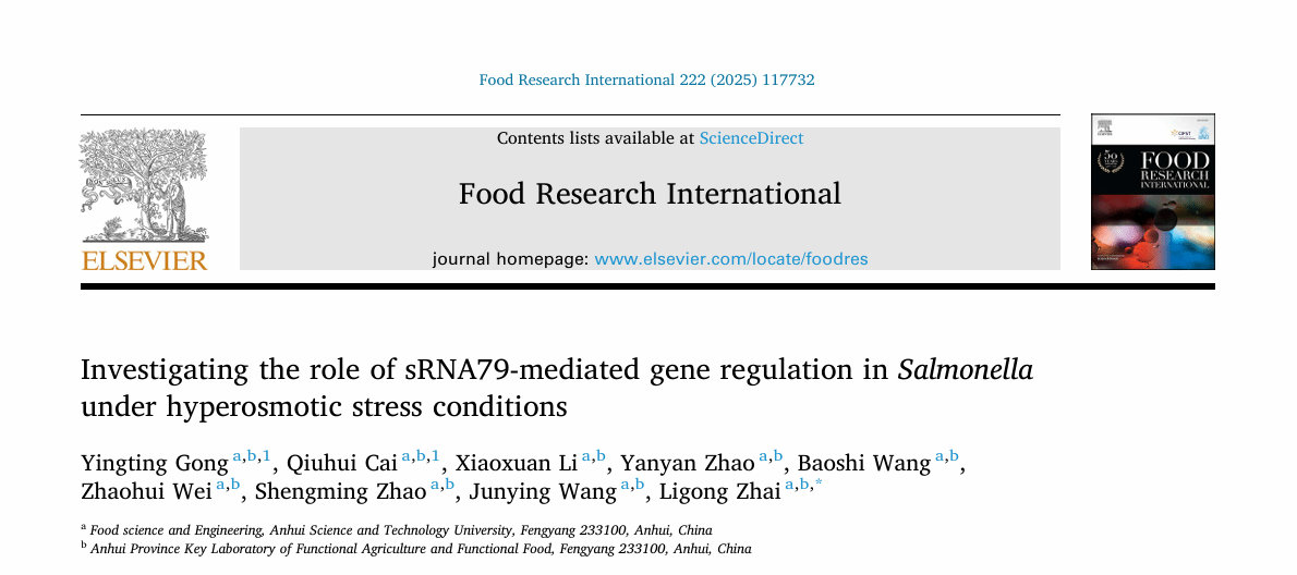 近日,我校食品科学与工程学院食品质量与安全团队在农林学科领域顶级期刊《Food Research International》(中国科学院1区top期刊,影响因子8.0)发表最新研究成果。论文题为“Investigating the role of sRNA79-mediated gene regulation in Salmonella under hyperosmotic stress conditions”,由我校2023级食品加工与安全领域研究生龚莹婷为论文第一作者,翟立公副教授为通讯作者,半岛app官方在线入口为第一完成单位。