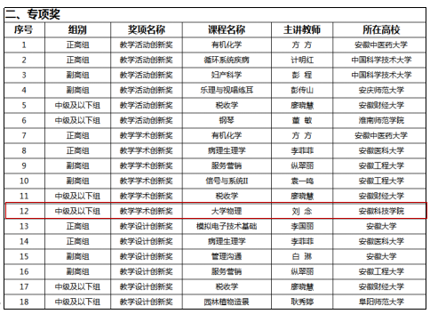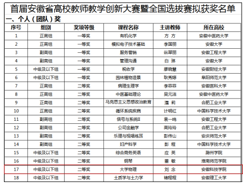 4月11日,首届安徽省高校教师教学创新大赛暨全国选拔赛现场赛在安徽大学磬苑校区举行。从全省46所高校159支队伍中脱颖而出的18支教师团队,分正高组、副高组和中级及以下组参加比赛。经过激烈角逐,我校刘念老师获中级及以下组二等奖和教学学术创新专项奖两项殊荣。
