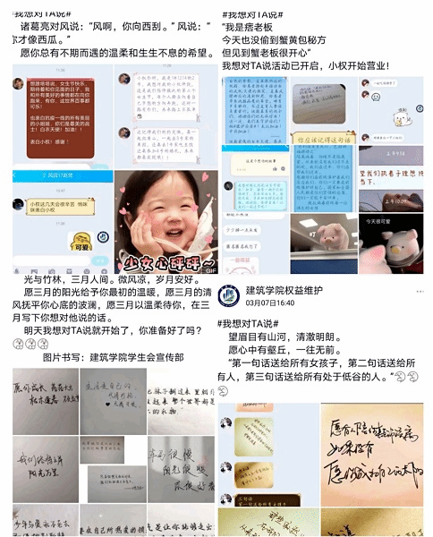 活动发布后,同学们的参与热情很高。“绘青春”这一模块的作品主要以女性医护人员在新冠肺炎战疫中所作的贡献和牺牲为主题,展现当代女性“巾帼不让须眉”的风采。“镜头下的芳华”这一模块的作品主要是女生们的生活照,通过镜头记录女生日常生活最真实的模样。“我想对TA说”中,同学们通过一段段优美的话语,向“TA”表达自己内心最真实的感受。