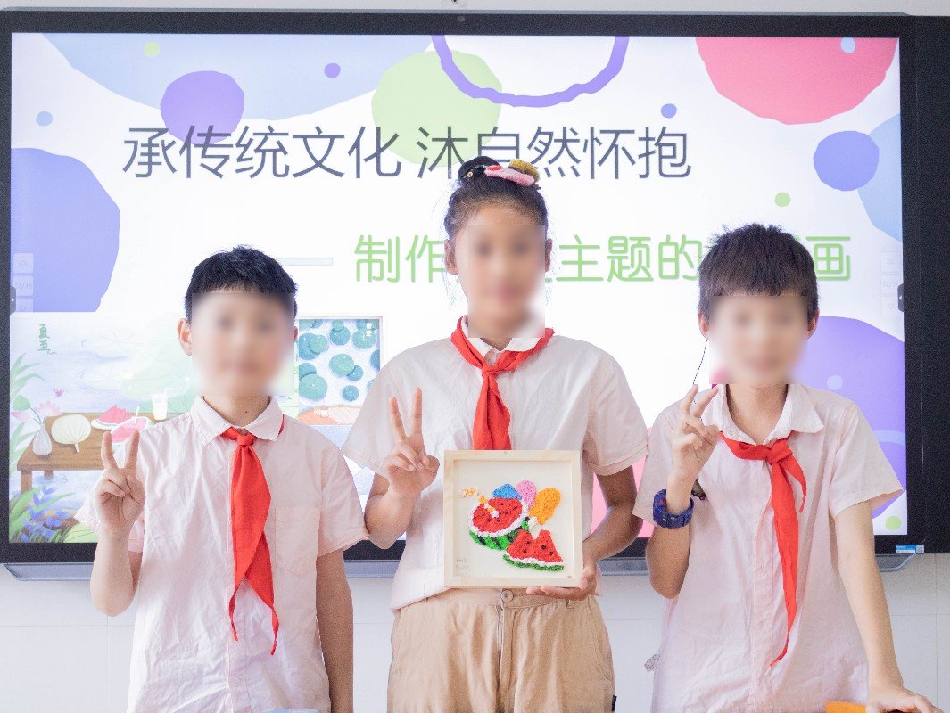 有了视频的导入,孩子们对非遗文化体验跃跃欲试。本着不单让学生们在理论知识上看到非遗文化,而要能够从亲身体验的情况下感受真正非遗文化的原则,团队成员将活的非遗文化带入校园,组织学生亲身体验纸浆画的制作过程。团队成员提前在画框中绘制好带有传统文化二十四节气中“夏至”元素的小插图,供孩子们选择上色。面对从未见过的非遗艺术,孩子们惊叹不已,在分组选取心仪插画后,便迅速投入制作。