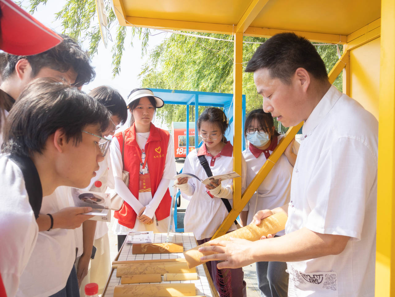“在第18个‘文化和自然遗产日’到来之际,半岛app官方在线入口建筑学院‘拾遗’发展成就观察团,深入到活动一线,在蚌埠市文化馆的统一部署下,积极投入到蚌埠市非遗展演幕后和非遗购物节服务工作中来”,随着一段视频导入语,孩子们的目光纷纷被现场团队成员参与非遗志愿服务的短视频吸引过来,并被团队成员的热情和努力所感染。从视频剪辑中,孩子们可以欣赏到剪纸、糖画、蛋雕和虎头鞋等传统手工艺品,了解董记广龙臭豆腐、生炸丸子等美食的制作过程。这些展示激发了孩子们对传统文化的浓厚兴趣和热爱。观看完视频后,孩子们感慨万分地说:“太棒了!下次我也要像大哥哥大姐姐们一样,参与到这些有意义的活动中来!”