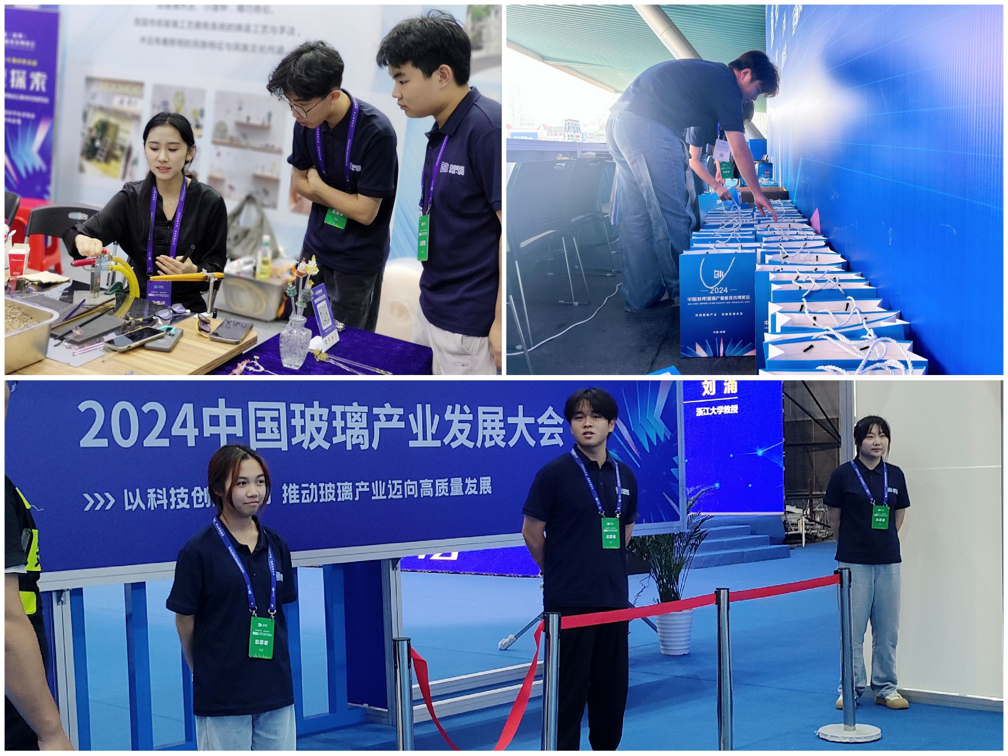 在蚌埠会展中心举办的“中国(蚌埠)玻璃产业新技术博览会”上,志愿者们分布于东门服务台、玻璃体验区、会议现场及公共区域,各司其职。他们协助分派物料、引导参观者、维护秩序与人流,确保博览会的顺利进行。志愿者们的辛勤工作展现了新时代青年的风采,为博览会的成功举办贡献了一份力量。