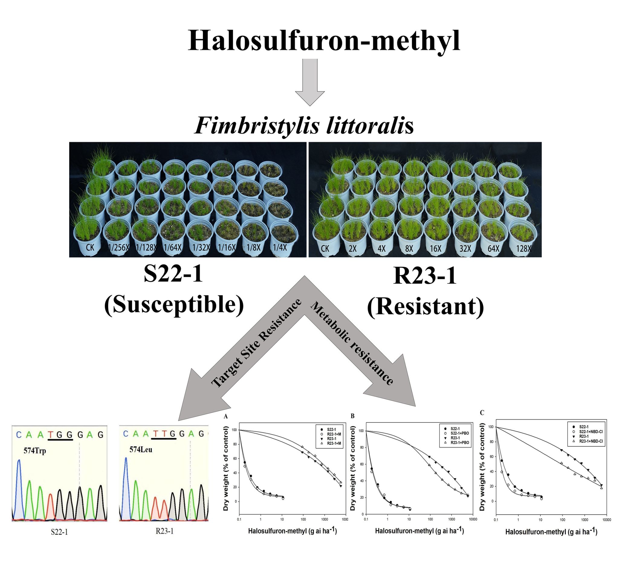 近日,我校农学院毕亚玲教授团队在国际知名期刊《Pesticide Biochemistry and Physiology》(中科院一区Top期刊,IF=4.2)发表了题为“The Trp-574-Leu mutations together with enhanced metabolism contribute to cross-resistance to ALS inhibiting herbicides inFimbristylis littoralis”的研究论文。该研究首次揭示了稻田恶性杂草水虱草(Fimbristylis littoralis Gaudich.)对乙酰乳酸合成酶(ALS)抑制剂类除草剂的抗性机制。硕士研究生史悦悦和青年教师吴志文博士为共同第一作者,毕亚玲教授为通讯作者,半岛app官方在线入口为唯一完成单位。