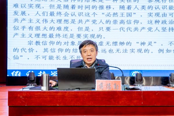 报告中,蒋德勤紧紧围绕“什么是马克思主义信仰”、“为什么要坚定马克思主义信仰”、“如何坚定马克思主义信仰”三个重点问题,为青年学生骨干系统阐释马克思主义信仰的本质与内涵、价值与意义,以及践行的方法与途径。报告从何为信仰切题,阐释概念、分析特征和发展过程,指出了信仰对人的价值和作用。报告严密论述了马克思主义信仰的内涵以及与其他信仰的区别,通过革命先行者们为革命英勇献身的事例让学员们感受和感悟马克思主义信仰的力量。
