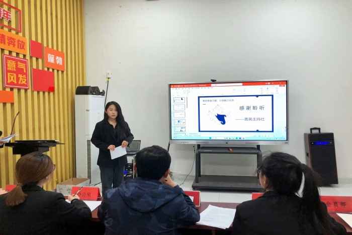 社团评优答辩由现场PPT演示和答辩两个环节组成,各学生社团代表依次从内部介绍、活动开展、财务状况、人才培养、未来展望等方面向评委展示社团风采及活动成果,PPT演示结束后,评委根据演示情况和社团工作实际、对社团工作进行提问,并提出建设意见。
