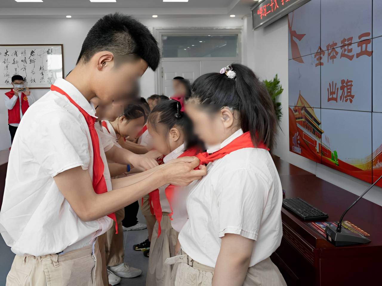高年级的少先队员们,他们从懵懂的新队员慢慢成长,如今以他们的责任与担当,将新队员拉进到了少先队这个温暖的大集体中。童心向党,薪火相传,新老队员互敬队礼。在这一刻,孩子们眼神坚定,有力的小手举过头顶,庄严地献上了自己的第一个队礼,传递着少先队员的使命和责任。这个特殊而又神圣的时刻将永远铭刻在孩子们的心中,激励他们坚定地走好接下来的每一步,为胸前的红领巾增光添彩。