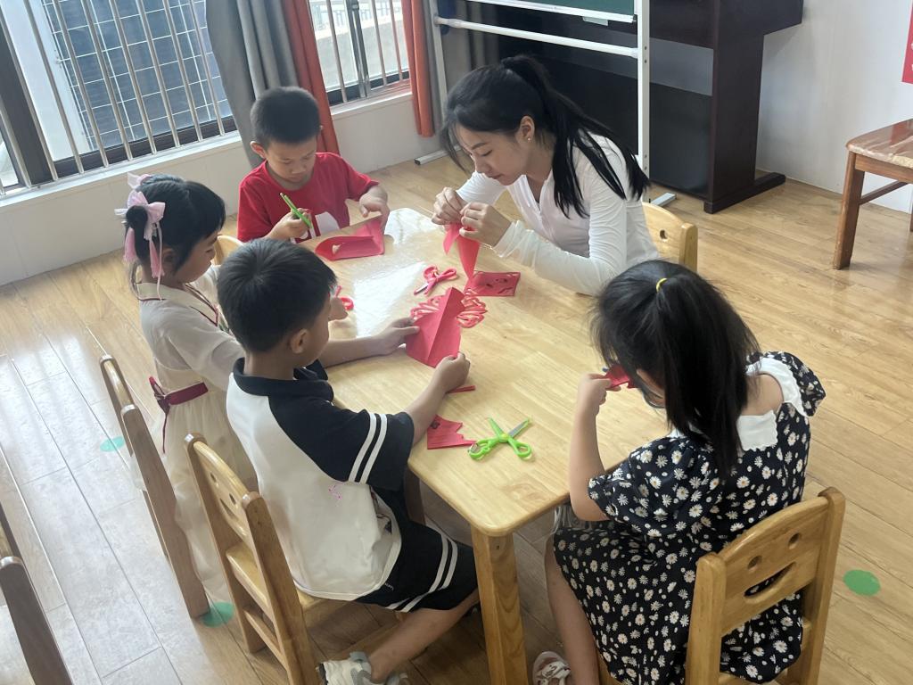 实践小队向幼儿园小朋友们讲解了剪纸的历史和剪纸的种类、剪纸的方法等相关知识,激发了小朋友对剪纸艺术的兴趣。从简单的折叠到剪法,实践小队一步步进行细致地讲授,小朋友们跟着学习,每个环节一丝不苟,在老师的指导下,小朋友们通过剪纸创作出一幅幅作品,在体验剪纸艺术的同时还感受了底蕴深厚的非遗文化。