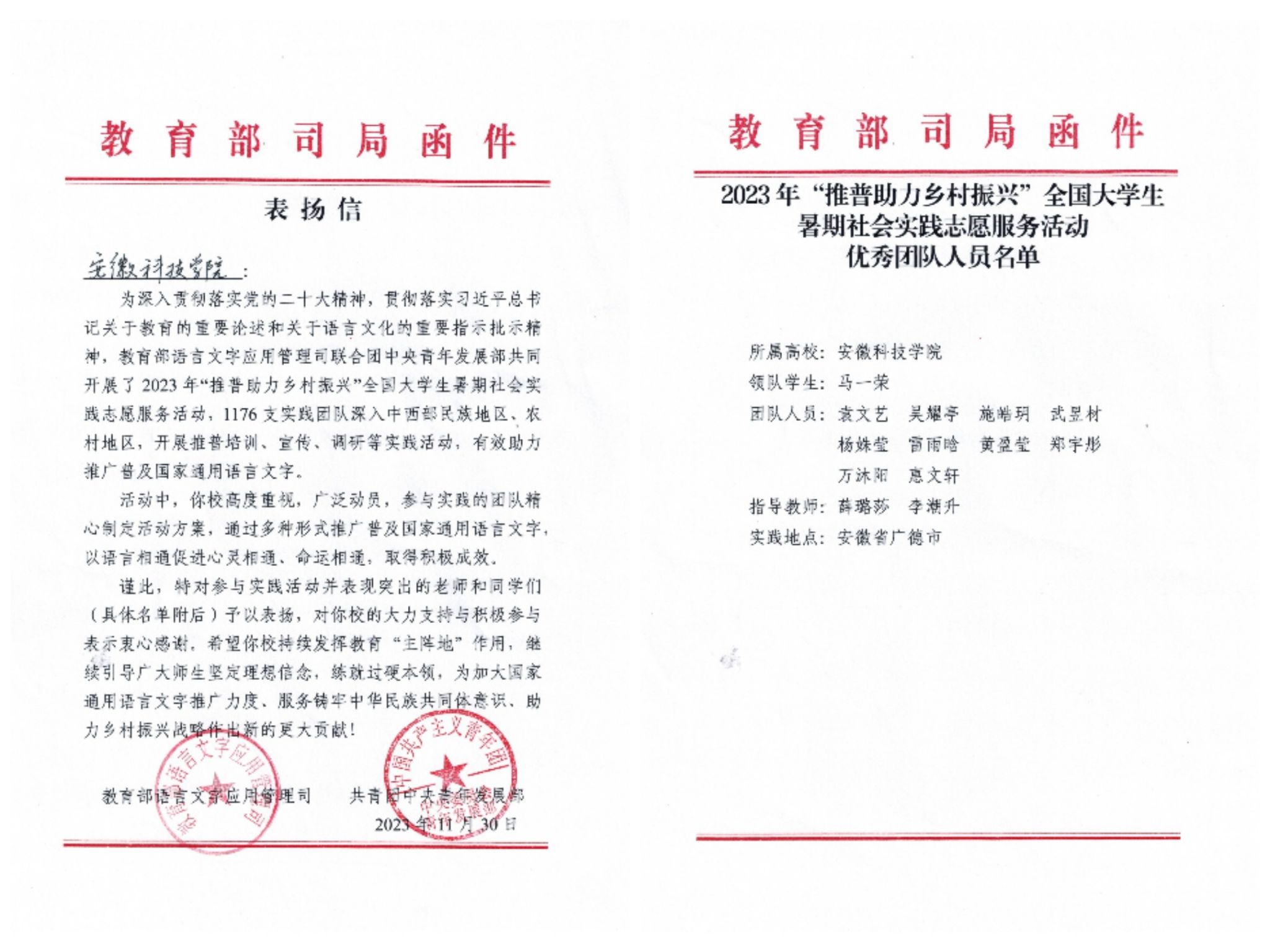 我校化学与材料工程学院“推普助力乡村振兴”暑期“三下乡”社会实践团队荣获2023年“推普助力乡村振兴”全国大学生暑期社会实践志愿服务活动“优秀团队”。1月17日,教育部语言文字应用管理司、共青团中央青年发展部向我校实践团队发来表扬信。