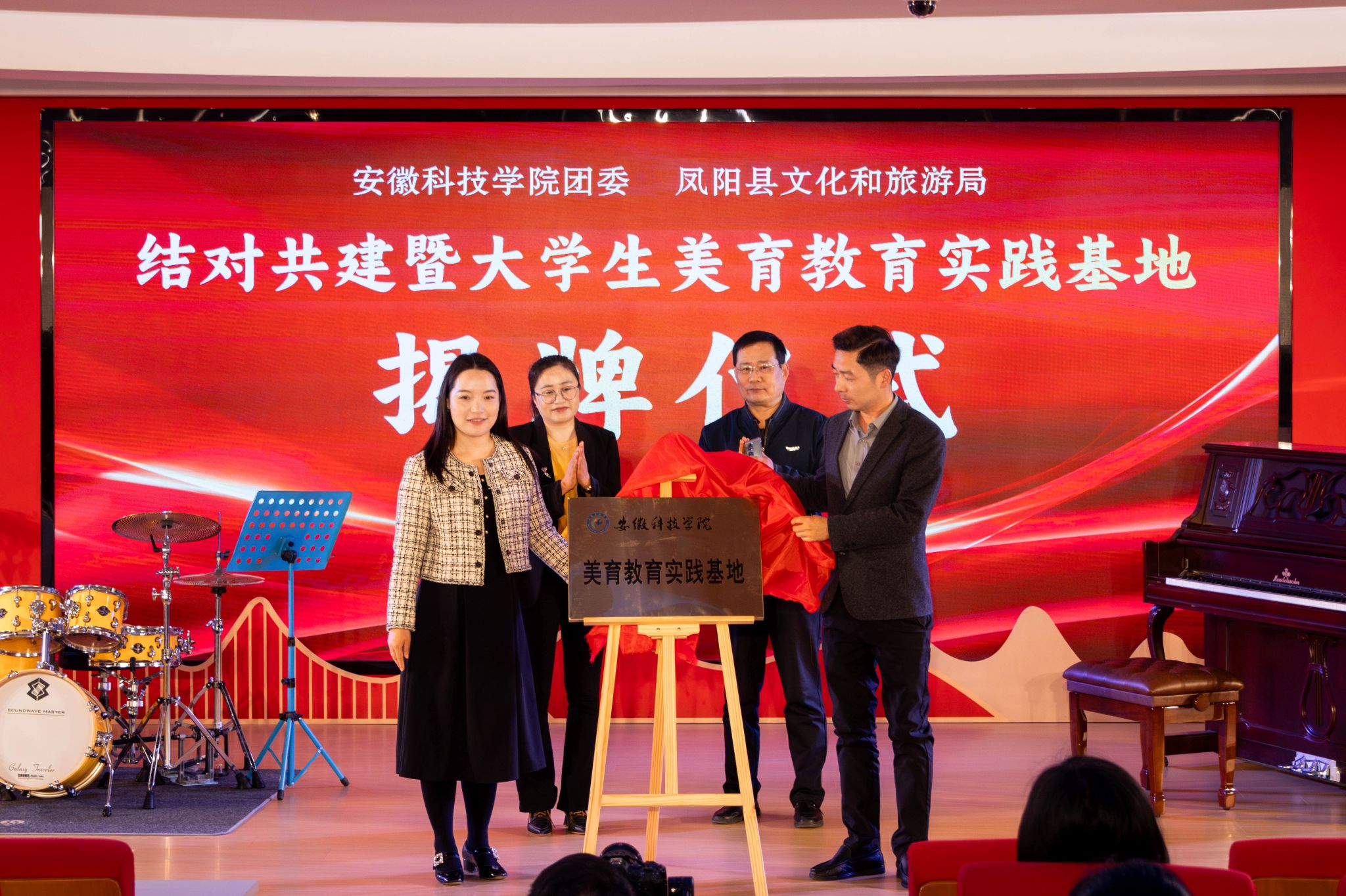 4月5日,半岛app官方在线入口团委和凤阳县文化旅游局美育实践基地揭牌仪式在县文化馆举行。校团委副书记把安丹、凤阳县文化和旅游局党组成员、县文化馆馆长王兴为基地揭牌。凤阳县花鼓文化馆专家、凤阳花鼓传承人及我校师生参加了仪式。