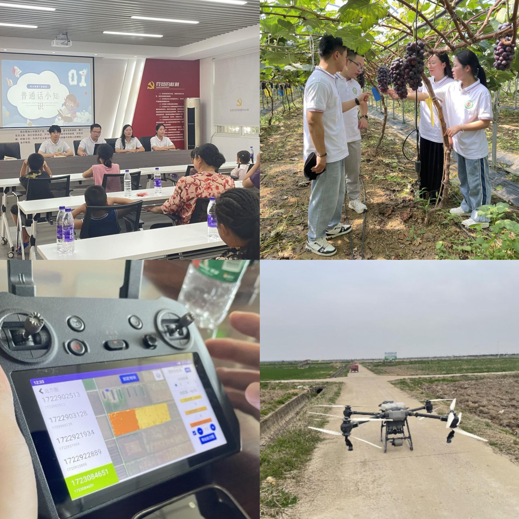 实践团的最后一站是当涂水稻科技小院。在这里,队员们充分发挥专业特长,开展了一系列助农服务活动。队员们协助农民操作大型农用无人机进行农药喷洒,提高了作业效率,减少了农药使用量,保障了农作物的健康生长。同时,队员们还教授了葡萄防治病虫害的方法,现场监测葡萄长势,与农民一起修筑田埂,巩固农田基础设施。