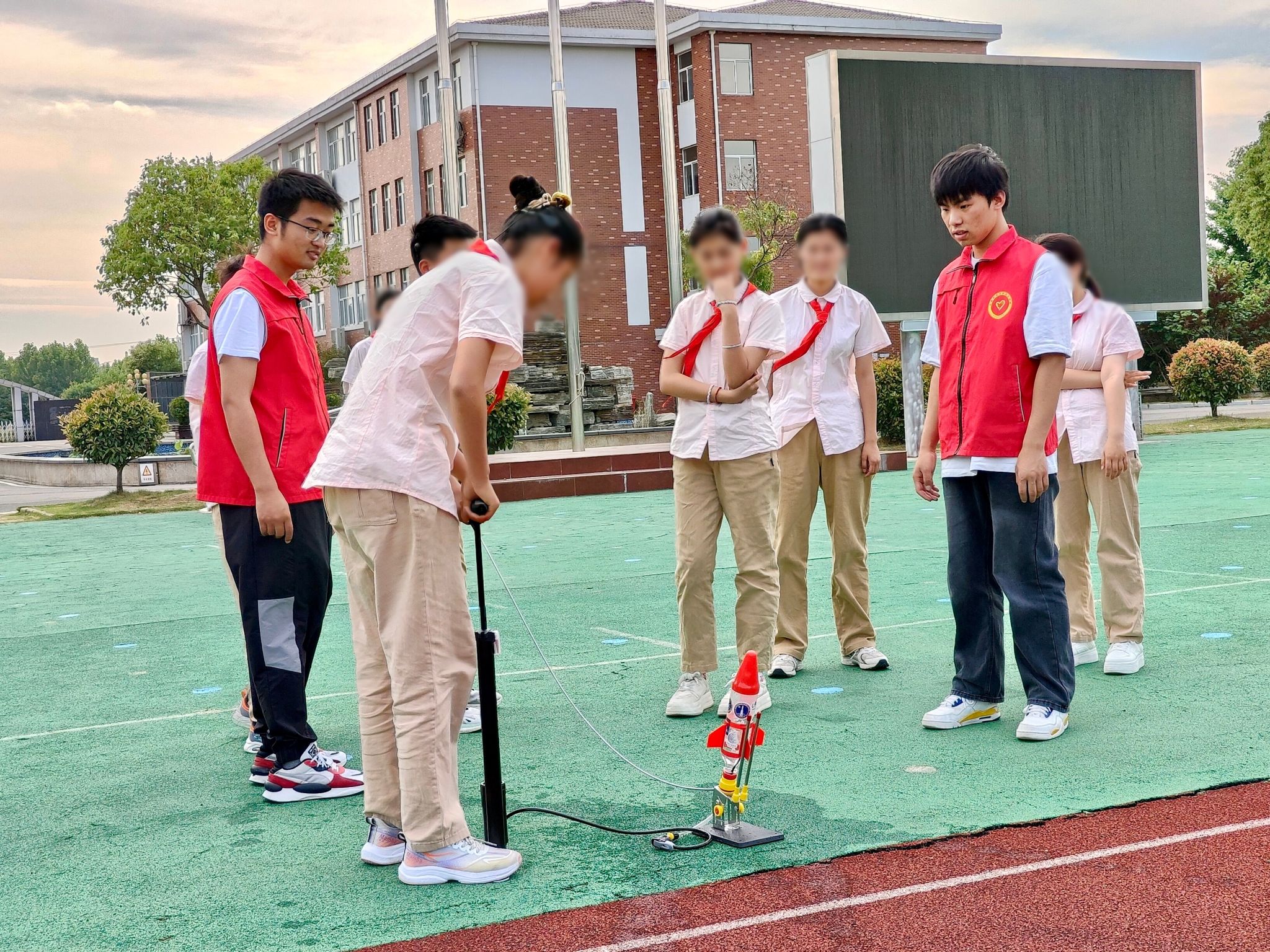 在孩子们对科技知识的浓厚兴趣被彻底激发之后,实践团成员们巧妙地组织了一场别开生面的户外水火箭发射活动。孩子们兴致勃勃地投入到水火箭的组装、加压、发射等每一个环节中,亲手实践、亲身体验。当水火箭呼啸升空,直上云霄的壮观景象展现在他们眼前时,孩子们目睹了从课本上的理论知识到现实实践的完美转化,那份成就感与自豪感在他们的脸上绽放,化为最灿烂的笑容。