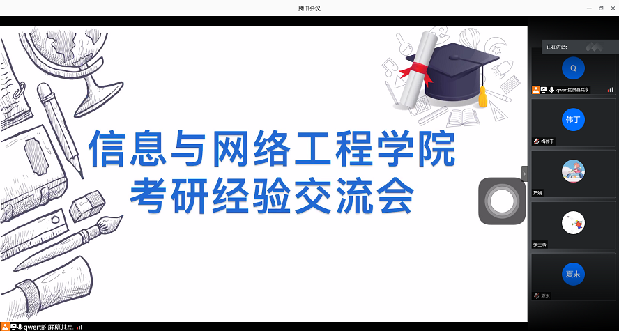 为引导学院学生树立正确考研目标,掌握相关考研技巧,了解更多考研信息,6月24日下午,信息与网络工程学院通过腾讯会议开展线上考研经验交流会。学院专职辅导员王培培、陈凯,五位2016级优秀考研学子张超、王盼盼、段润茂、童振凯、张涛出席本次交流会,2017级各班级共计175名拟考研同学参加了本次会议,会议由王培培主持。