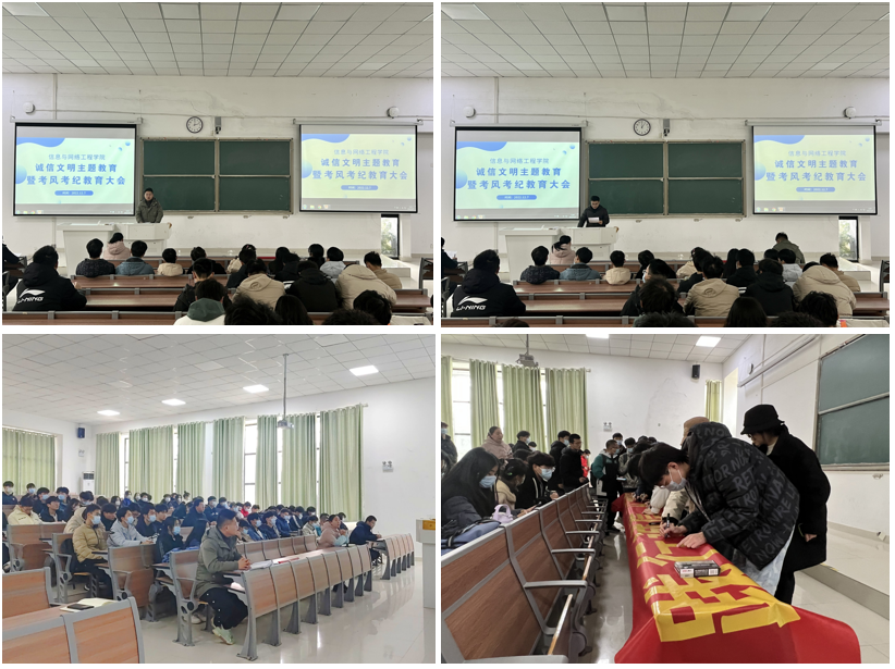 在考风考纪教育阶段。崔北坤带领大家学习了《半岛app官方在线入口考试工作实施细则(节选)》、《半岛app官方在线入口学生违纪处分办法》的部分内容及相关学生违纪处分文件,宣读了《信息与网络工程学院诚信考试倡议书》,倡导学生心中有诚信、手握纸和笔,坚决抵制作弊行为,创造优良学风,端正考风。韦乃学从考试存在的意义出发,引导同学们对于考试树立正确的认知,分析了考试作弊对于学生的危害,并希望各班级学生干部会后召开主题班会,学习相关文件,加强警示教育;督促班级同学认真复习、积极备考,树立底线思维;从我做起,发挥积极作用,做好关注预防。