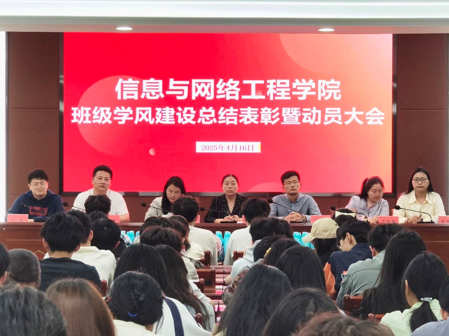 会上,班级学风建设“先进班级”、“先进个人”代表依次上台发言。汪琦宣读了《信息与网络工程学院党委关于表彰2024年班级学风建设“先进班级”、“先进个人”的决定》,崔北坤宣读《信息与网络工程学院2025年班级学风建设实施方案》。