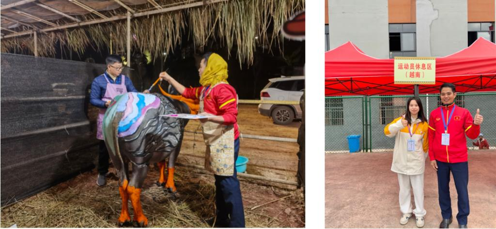 担任牛体彩绘现场翻译的2023级越南语笔译(硕士)专业的甘才慧同学说:“我之前并不了解牛体彩绘,当我真正接触这项比赛后十分惊叹,真切地从艺术家们的画笔下感受到了中老越三国的民族风情风貌、生产生活实景等文化特色。艺术家们以牛体彩绘的艺术形式展现了中老越三国与邻为善、以邻为伴、兼容并蓄、文明互鉴的美好愿景。”